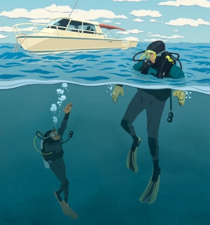 Natalie完成跨步式入水后费力地浮上了水面。在她和Steve游向船首准备下沉的时候她必须不停地踩水才能让头部保持在水面以上。他们相互示意都已准备好,即便Steve能看出来Ntalie为了能保持浮在水面上已经气喘吁吁。Natalie戴上调节器深吸了一口气同时放掉了BC里的空气。一口气呼出以后她马上沉入了水里。Steve只下潜了几英尺就看到Ntalie嗖的一下从他旁边射向了水底。她眼中露出了恐慌的神色疯狂地想要捂住鼻子以保持耳压平衡。她对她戴着的这双手套毫不熟悉,这让她几乎不可能完成这个动作。