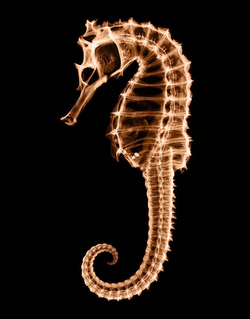 据说海马全身缀满许多突起物和丝状物体,在海水中张张扬扬、身体舒展,颇有些婆裟起舞的飘逸感,不像动物,倒更像是植物——丛生状的水生藻类,它们用这种形变的方法保护自己。