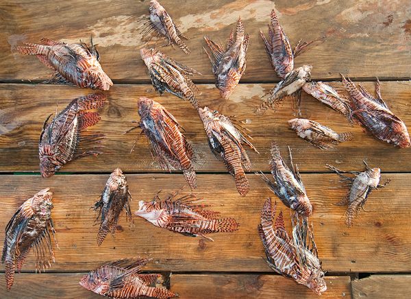 在洪都拉斯海岸附近坦岛海洋公园中,已经死亡的狮子鱼被扔在渔船甲板上。公园鼓励人们食用狮子鱼的尝试并非是什么罕见之举——美国海洋与大气管理局就曾举办过一次狮子鱼美食活动,“打不过它们就吃掉它们!”是这次活动的活动口号。