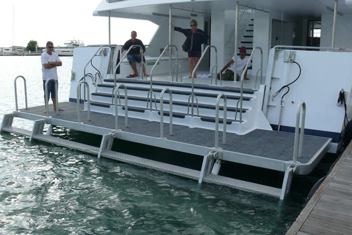 接下来重新登船会有多难?把脚放到到梯子上,攀爬上它是在大浪潜水时最难最危险的。你需要一个略低于水位有坚固把手,稍为大一点的,设计良好的潜水平台,同时需要船员帮你一把。相比之下,一些不好的梯子即使在平静的水面也是一个挑战。