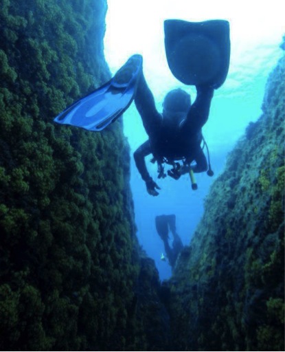 接下来的海底时光,chef 和潜伴终于没有在抓住我的手, 他们只是在我的视线周围关注着我,时而给我一个确认ok的手势, 我也终于逐渐适应这寒冷的水温。chef带着我们穿过了一个海底峡谷,峡谷两侧盘满了珊瑚,宽度也仅够一人通行,之后我们在海底岩石间的天然洞口穿过,绕着这片长长的礁石带来回穿行。最大下潜的深度也就是22米左右。我终于理解了潜水地图上标明的一个个洞口代表的含义了, 这个让人既爱又恨的礁石林里,因其海底礁石的所形成的各式洞口和峡谷,而提供了一个有趣的蛇形潜水路径,除了沿途领略特有的紫色柳状珊瑚林和各种海底鱼类,剩下的就是慢慢体会这里与众不同的地形地貌了。