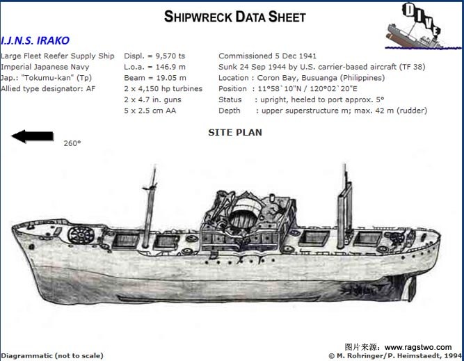 科隆沉船探险系列——IRAKO,RK伊良湖号在抵达r湾之前就已经受损。在rBy行动中,被美国空军的炮弹击中船桥位置而沉没。整船147米(485英尺)长,9570吨重,沉船几乎是直立的,倾斜约10度左右,尾部在45米(148英尺)水深。[