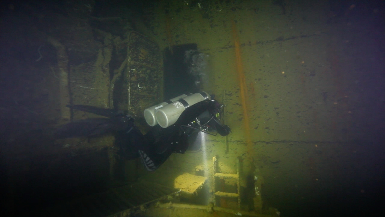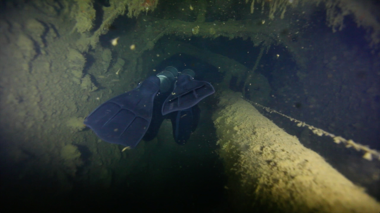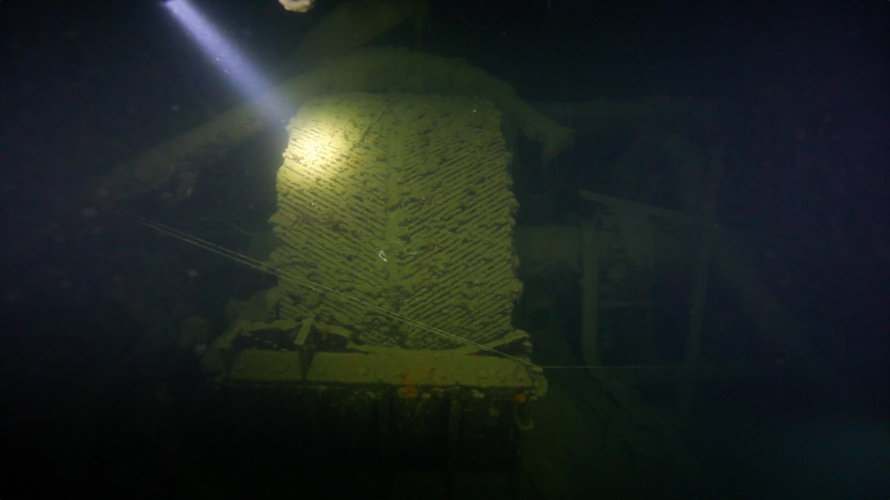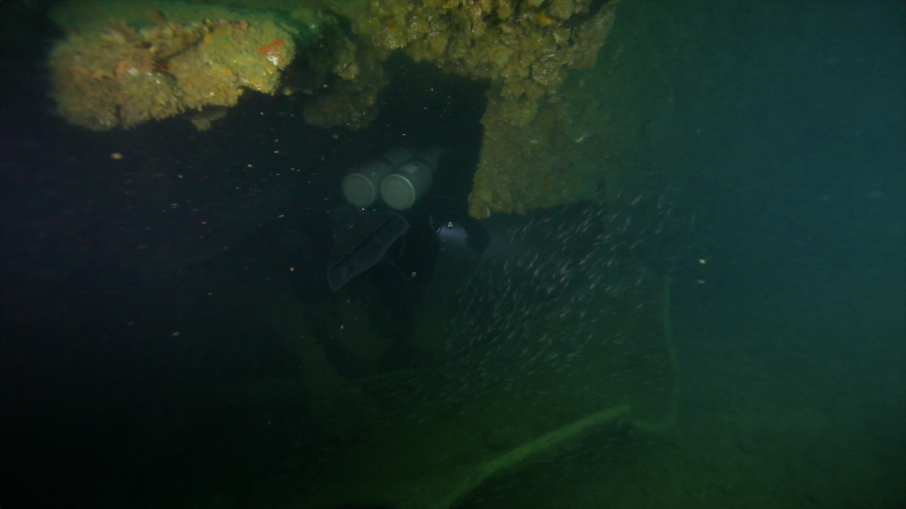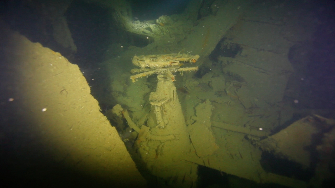 沉船后部的舵手室,那里还保留有完好的方向盘。接着我们进入大型货仓的分隔间。这里的结构已经被炮弹炸毁。沿着一个货仓的入口下到36米,然后来到厨房。天花板和地面之间的距离只剩下大约1.5米,因为炸弹的力量已经把所有的东西都压缩成了三明治一样。这里可以看到巨大带盖的锅,杂乱的电线和通风口。接下来还经过一个楼梯。还可选择从沉船的后部靠近舵的地方(40米)进入,再到达厨房。这仅仅适用于中性浮力非常好的有经验的潜水员。这些区域的积尘很多,稍微不注意就会扬尘,导致能见度变差。