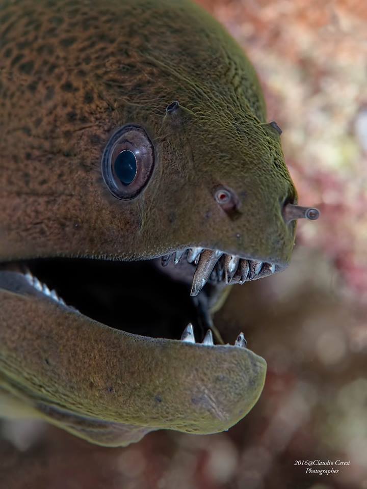 The green murena, Fimbriatedmoray, Gymnothorax fimbriatus North Sulawesi , Bunaken marinepark camera : nikon d800 housing : Isotta d800 lens: nikkor 105 micro vr strobe : 2 x Inon z240 1/200 f16 iso 100 photo byClaudio Ceresi
