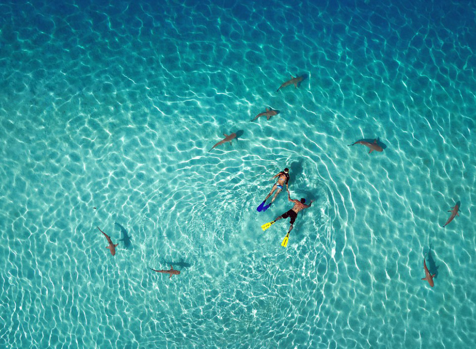 自然类大赛一等奖得主是这张潜水者与鲨鱼共泳的航拍照。
