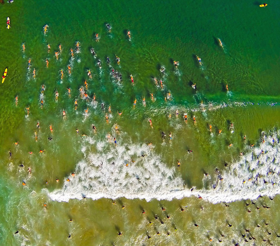 这张数十名游泳者在海中共泳的航拍照获得自然类大赛二等奖。