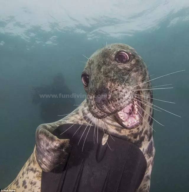 水下摄影:激萌小海豹紧抱潜水员脚蹼,深海中有危险的动物,但同时也有可爱的生物,这个萌系的小海豹攀上了摄影师的深水蹼,露出好奇的表情,摄影师尼克·布莱克在布里斯托下水时抓拍下了这一瞬间。也正是这张照片为他赢得了世界规模最大的水下摄影比赛的奖项。此次比赛总共有超过6000张的摄影作品
