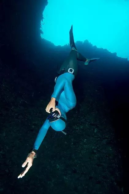 由于不需要背负潜水装备,在水下拍摄人物的时候,戴着面镜和纤长脚蹼的自由潜水员,宛如一条人鱼,非常上镜。