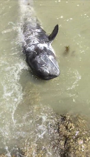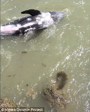几个乘坐小艇的渔民很快过来,将这只海豚拖回到了深水区。不过,海豚似乎已经放弃了挣扎,它在水里打转,似乎已经不能很好地浮到水面。