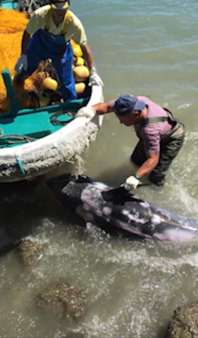 北京时间9月16日消息,据英国《每日邮报》报道,海豚保护者瑞克·欧贝瑞(Ric O'Barry)近日在日本太地町拍摄下一段令人心碎的视频。一只为了躲避捕杀的海豚冲到了海岸岩石上,在即将搁浅的时候被赶来的渔民又拖回了海里。
