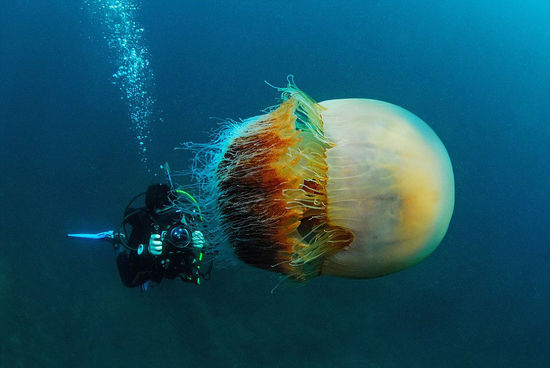 摄影师日本深海潜水遇罕见巨型野村水母,[hme_12671lglgeerwh550]图中向人们展示了一只巨大的“野村水母”,这是巴西摄影师露西娅·特瑞在日本越前海岸潜水时拍摄的。国际在线消息:据