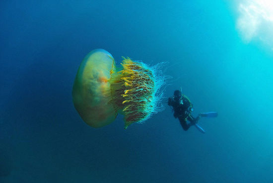 图中向人们展示了一只巨大的“野村水母”,这是巴西摄影师露西娅·特瑞在日本越前海岸潜水时拍摄的。