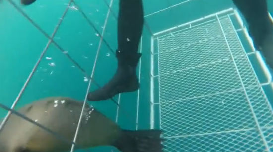 海豹想游出防鲨笼,不料圆滚滚的身体却被栅栏卡住。潜水员见状轻踢海豹,助其脱困。图为网络视频截图