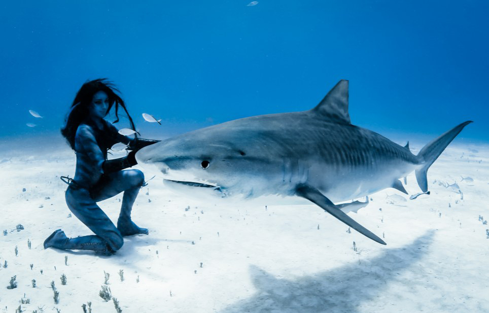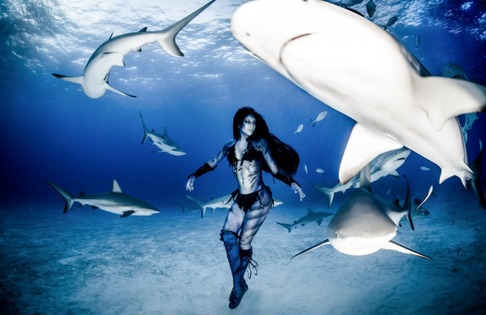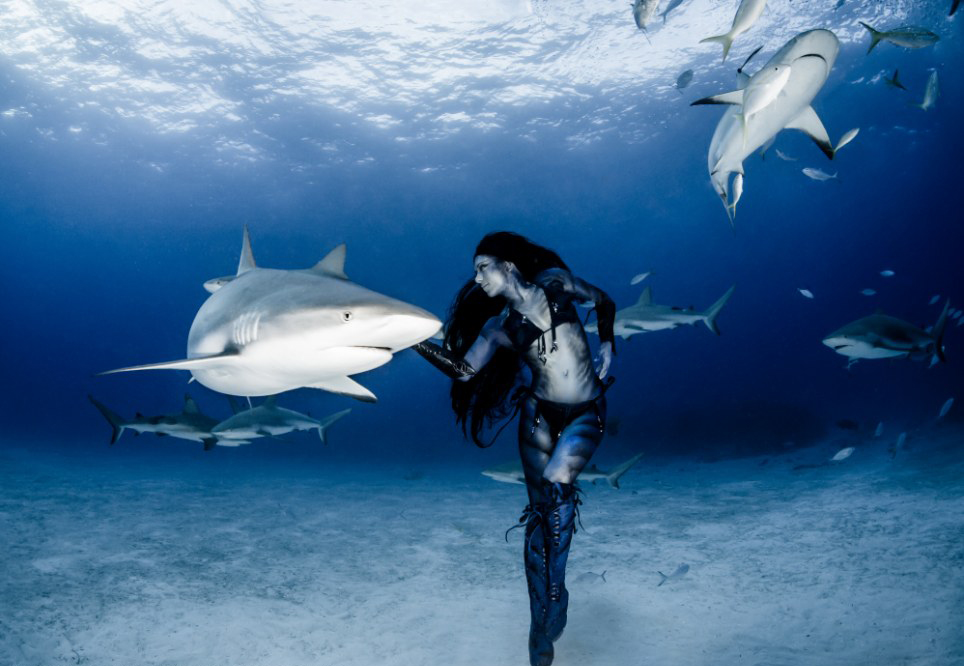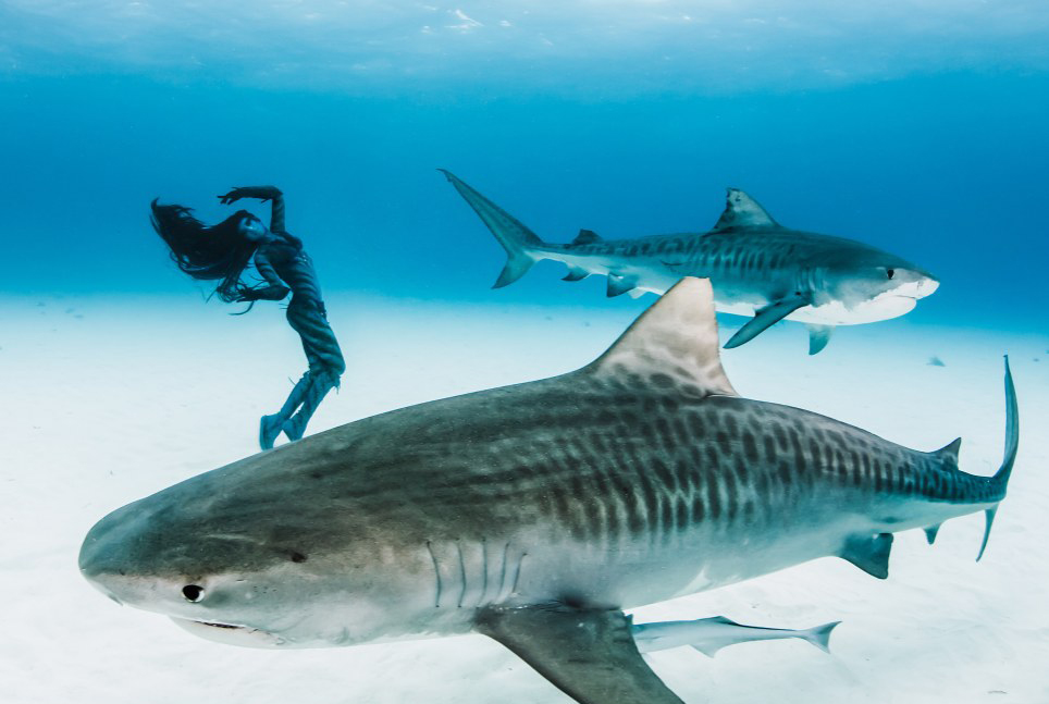 美女模特与虎鲨群海底共舞