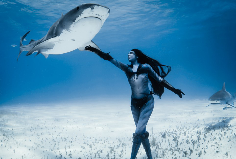 惊险时刻:艾美奖获奖摄影师肖恩·海因里奇斯(Shawn Heinrichs)抓拍弗雷泽冒着生命危险与虎鲨共舞的惊险时刻,她曾打扮成美人鱼形象拍摄诸多水下照片。