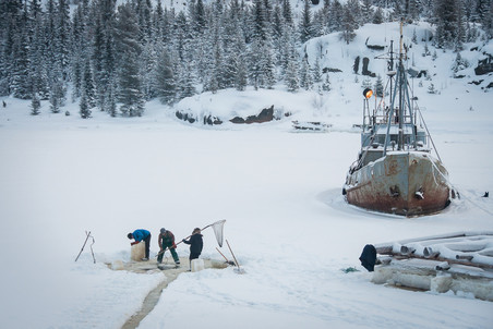 拿着绳子的这个男人,冬天被潜水俱乐部临时雇用,算是很走运了,好歹有一些额外的收入。而剩下的人们只能苦等着春天的到来,吃光喝光在夏天打渔时留下的存粮。